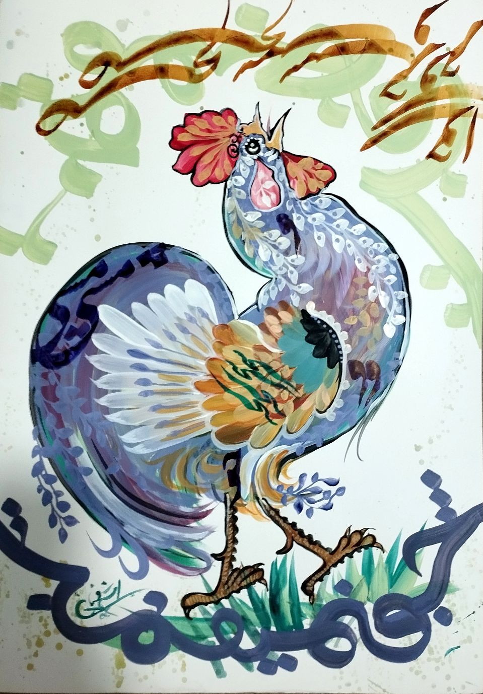 نقاشی مرغ سحر(از مجموع خروس مشتی) اثر هنرمند محمدباقر اشرفیان